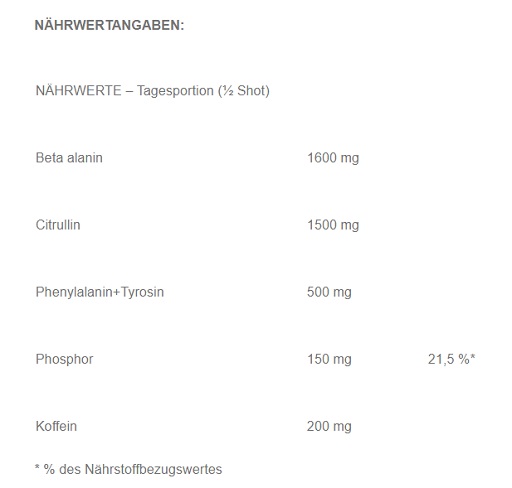 Das Produkt ist ein flüssiger Pre-Workout-Booster, der entwickelt wurde, um dich bei deinen Trainingseinheiten zu unterstützen. Mit einer Kombination aus Koffein, Beta-Alanin, Citrullin, Tyrosin und Phenylalanin sorgt der Shot für mehr Energie und Fokus, um deine Leistung zu steigern. Phosphor trägt zur Unterstützung des normalen Energiestoffwechsels bei.